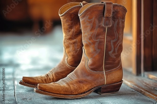 Pair of worn brown leather cowboy boots with stitched decorative patterns standing on wooden floor near door