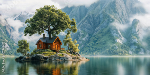Paisagem com casa isolada em uma ilha, cercada por montanhas e natureza exuberante. A imagem transmite paz e tranquilidade, perfeita para criar um ambiente relaxante e inspirador.