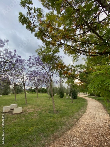 Paisaje con camino que dirige hacia los arboles, bancos de piedra sobre el césped.