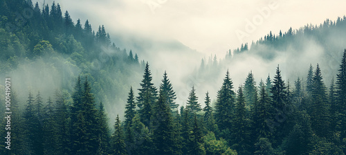 Paisaje de bosque brumoso con pinos y niebla en las montañas. Fondo de naturaleza abstracta. Paisaje de bosque con árboles coníferos y follaje verde.