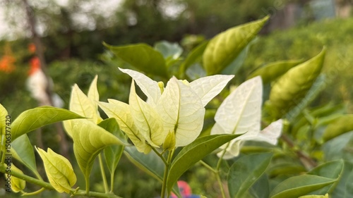 Pale Bougainvillea with its delicate white bracts blooms gracefully in a lush garden