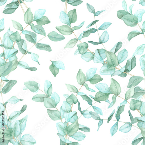 Pale green eucalyptus sprigs painted with soft watercolor strokes. This botanical foliage seamless pattern is well-suited for decorative wrapping paper, digital designs, and home textiles