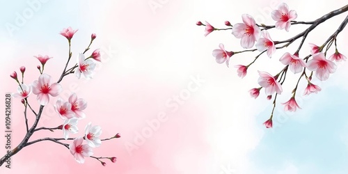 Pale pink and baby blue ombre background featuring hand-painted cherry blossoms, cherry blossom branches, spring flowers, soft focus