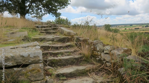 Pale Stone Steps Gently Ascending a Dry Hilltop—Showcasing Weathered Stone Texture and Sparse Dry Foliage Around, Capturing a Serene, Rustic Outdoor Scene with Soft Natural Light Ideal for Landscape o