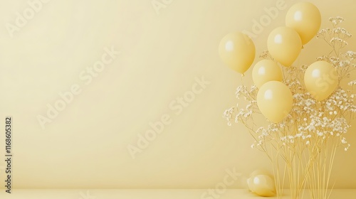 Pale Yellow Balloons and Flowers Against a Soft Background