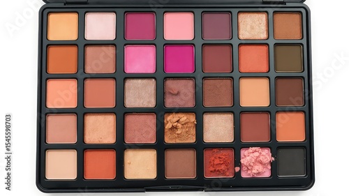 Palette of assorted colors cosmetic eye shadow for professional makeup artistry on a bright white surface