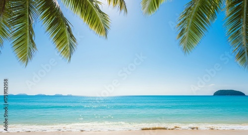 Palm fronds frame a tranquil turquoise ocean meeting a sandy beach under a clear blue sky