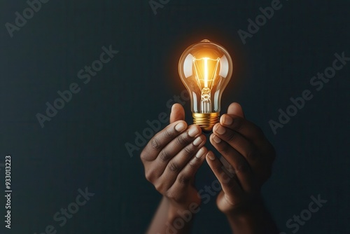 Palm hands gently holding a glowing light bulb, symbolizing protection and nurturing of ideas, dark background, conceptual art