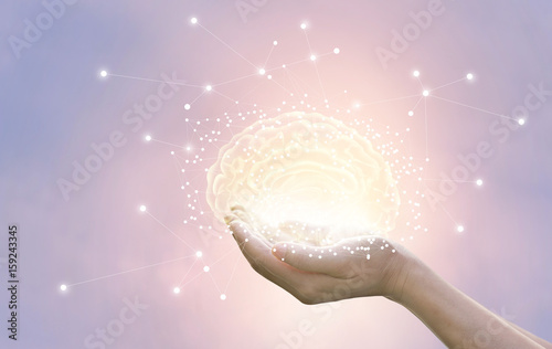 Palm hold and protect virtual brain on pastel background, innovative technology in science and medical concept