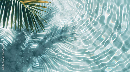 palm leaf shadow from above over transparent water surface with sunlight reflection topview, abstract background for travel, beach vacation and wellbeing