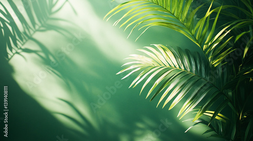 Palm leaf shadow on a green wall background. Olive color stylish flat lay with trendy shadow and sun light