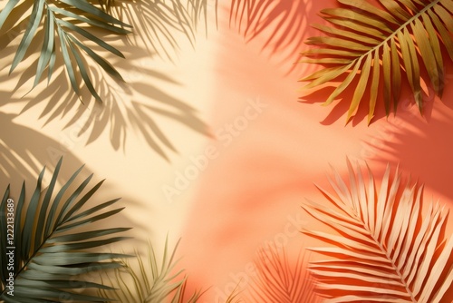 Palm leaves cast shadows on a coral background. Ideal for summer, travel, or tropical themed designs.
