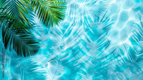 Palm leaves cast shimmering shadows on a turquoise pool surface