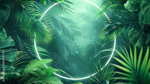 palm leaves in shades of lime green, forest green, and emerald, encircling a glowing crescent neon