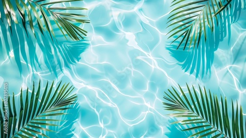 Palm leaves on rippling blue water background, frame print