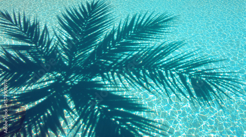 Palm tree branches shadow on blue water surface. shadow of palm leaves on blue texture background. Concept of tropical beach and summer vacation, Luxury travel holiday