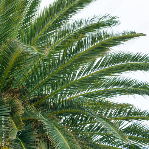Palm Tree Crown on Bright Sky Background. Summer Vacation Concept.