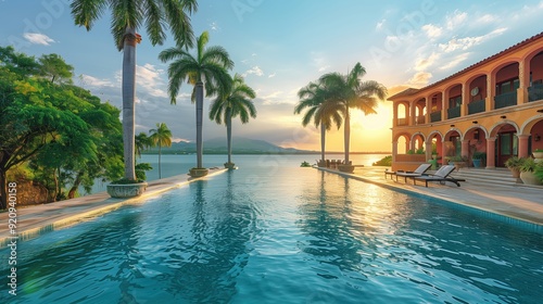 Palm tree on tropical beach. Vacation. Luxury travel. Tropical resort hotel. Fantastic vacation and peaceful atmosphere. Travel advertisement. Villa, bungalow. Ocean. Pool. Summer vacation