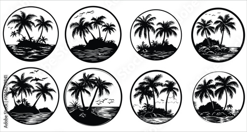 Palm trees and sunset silhouettes, Tropical landscape, Tropical beach landscape silhouettes vector, Summer vacation concept circle icon, Tropical paradise island logo silhouettes