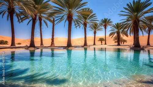Palm trees border a tranquil oasis pool in a desert landscape
