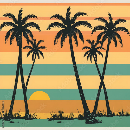 Palm Trees on a Beach with Gradient Stripes in Orange, Yellow, and Green - Serene Sunset T-shirt Design.