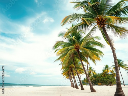 Palm trees swaying in the wind on a sandy beach, foliage, palm trees, sand
