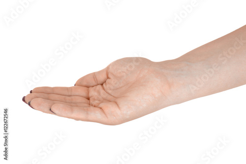 Palm up giving something, adult female's skin, red manicure. Isolated on white background