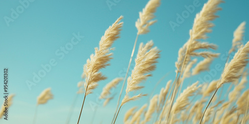 Pampas grass sways gently in the wind under a clear blue sky, creating a serene and picturesque natural scene.