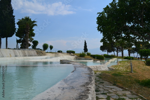Pamukkale travertines captured with fields and some people around. Captured in daytime.