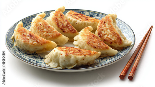 Pan fried dumplings on decorative plate with chopsticks