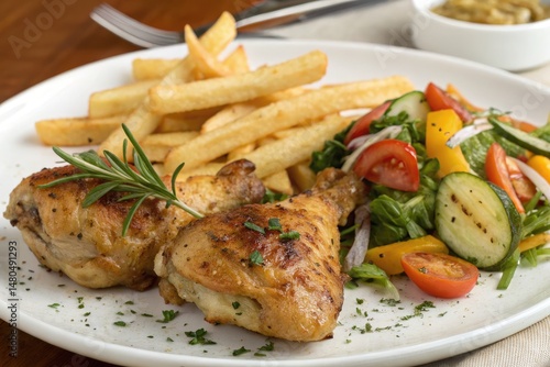 Pan Roasted Chicken Served With Crispy French Fries and Salad Generative AI