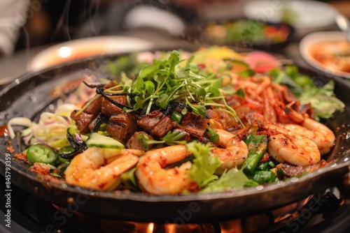 Pan with shrimp and vegetables cooking on the stove, korean food