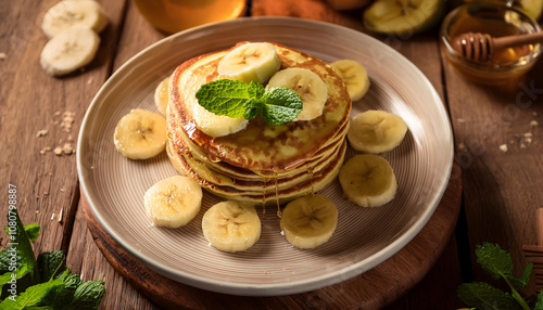 pancake, pancakes, with, bananas, banana, wooden, close up, food, new, breakfast, stack, plate, meal, syrup, homemade, delicious, sweet, cakes, morning, cake, snack, pieces, slices, tasty, modern, ad,