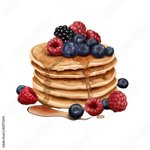Pancake stack with fresh berries die cut PNG style isolated on white and transparent background