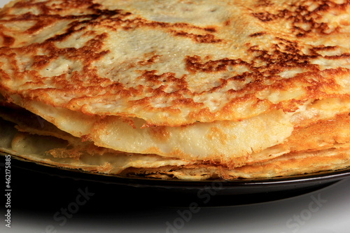 Pancakes on the black plate.Stack of tasty pancakes on white background. delicious pancakes in a stack