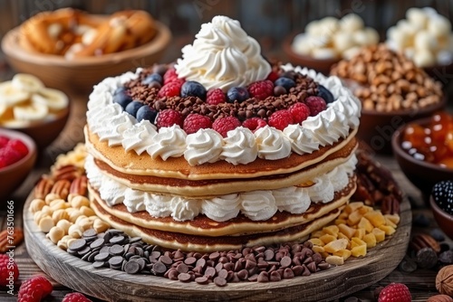 Pancakes stacked high with whipped cream and topped with fresh berries