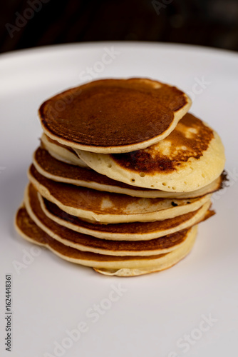 pancakes stacked together on a white bowl, a tower of small milk pancakes on a bowl, side view