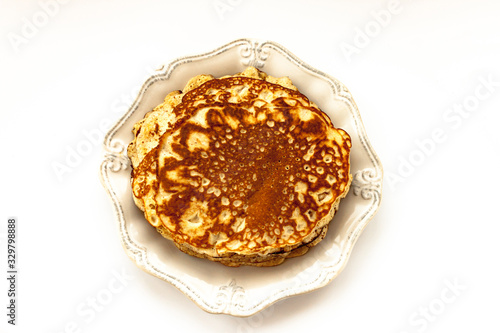 Pancakes top view stack on white color vintage plate isolated on white background close up
