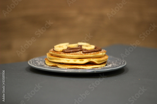 Pancakes with chocolate and banana on blue plate on dark wooden background