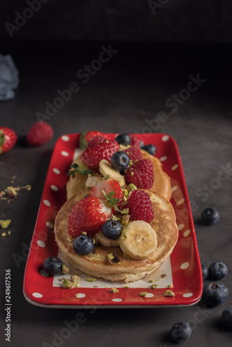Pancakes with strawberries, raspberries, blueberries, banana, pistachios and syrup on a red plate with white dots. Vertical. Copyspace