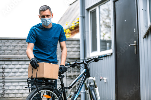 pandemic home delivery of food by bicycle. social distancing for infection risk