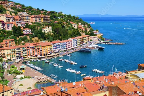 panorama from above of Porto Santo Stefano on the coast of Monte Argentario in Grosseto, Tuscany, Italy