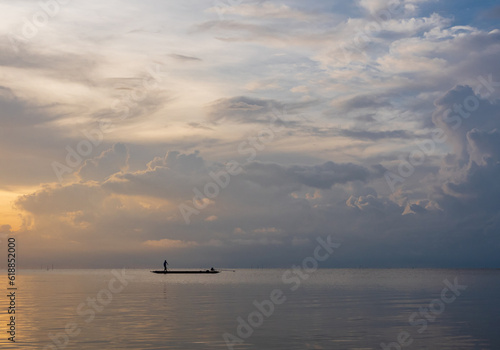 Panorama front viewpoint landscape travel summer sea wind wave cool on holiday calm coastal sunset sky light orange golden Nature tropical Beautiful morning hour day At thale Noi Phatthalung Thailand.