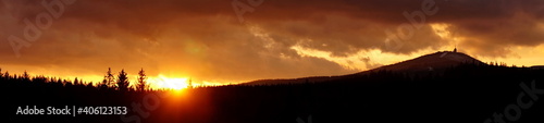 Panorama of a hill Lysa hora in Beskydy Mountains at dramatic sunset - Czech Republic, Europe