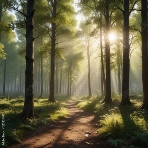 Panorama of a Wald with sunlight filtering through trees, nature, foliage