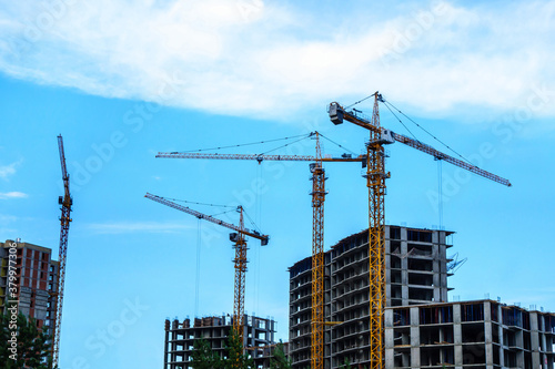 Panorama of complex of high-rise buildings under construction. There are four working tower cranes