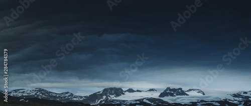Panorama of gloomy cloudy Norwegeian mountains covered in snow, Norway