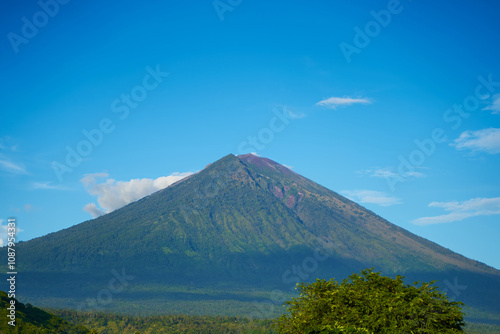Panorama of Mount Agung and rice fields on the island of Bali. View of the mountain against a background of palm trees and a cornfield. Panorama of Agung volcano covered with clouds on a sunny day.