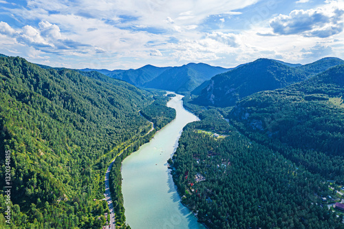 Panorama of mountain summer landscape of fast river Katun, Altai mountains, Russia.