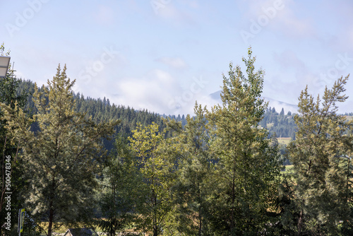 Panorama of mountains in the Ukrainian Carpathians on a summer day.